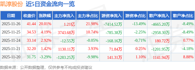 证券之星消息,截至2025年11月26日收盘,凯淳股份(301001)报收于41.44元,上涨20.01%,涨停,换手率27.96%,成交量14.06万手,成交额5.5亿元。