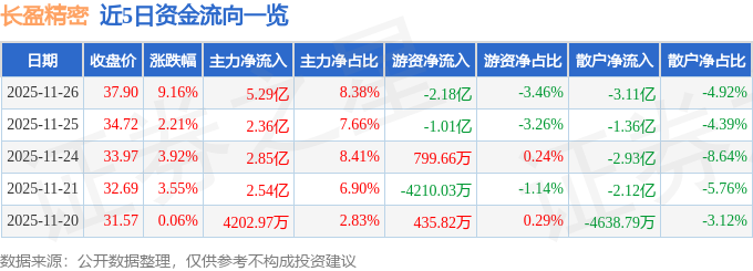 证券之星消息,截至2025年11月26日收盘,长盈精密(300115)报收于37.9元,上涨9.16%,换手率12.44%,成交量168.83万手,成交额63.12亿元。