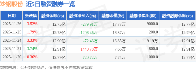 沙钢股份融资融券信息显示,融资方面,当日融资买入5660.31万元,融资偿还5940.22万元,融资净偿还279.91万元。融券方面,融券卖出2.71万股,融券偿还1.81万股,融券余量17.77万股,融券余额104.49万元。融资融券余额12.77亿元。
