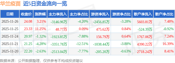 证券之星消息,截至2025年11月26日收盘,华兰疫苗(301207)报收于24.08元,上涨3.21%,换手率5.1%,成交量30.65万手,成交额7.49亿元。