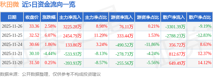 证券之星消息,截至2025年11月26日收盘,秋田微(300939)报收于33.36元,上涨2.58%,换手率8.87%,成交量10.65万手,成交额3.59亿元。