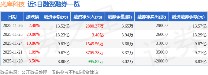 光库科技融资融券信息显示,融资方面,当日融资买入9.52亿元,融资偿还9.24亿元,融资净买入2880.37万元,连续3日净买入累计3.84亿元。融券方面,融券卖出0.0股,融券偿还2900.0股,融券余量3.65万股,融券余额549.87万元。融资融券余额13.57亿元。