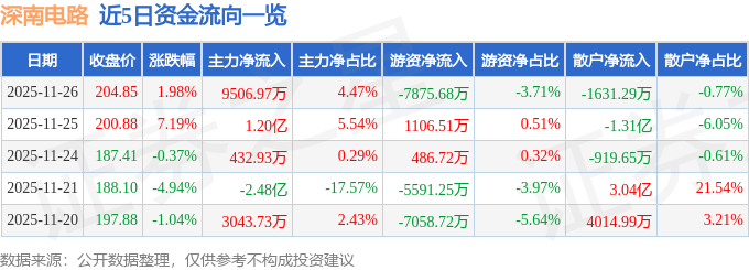 证券之星消息,截至2025年11月26日收盘,深南电路(002916)报收于204.85元,上涨1.98%,换手率1.55%,成交量10.3万手,成交额21.26亿元。
