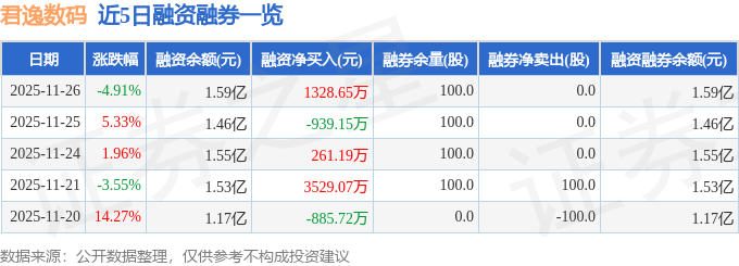 君逸数码融资融券信息显示,融资方面,当日融资买入5410.46万元,融资偿还4081.8万元,融资净买入1328.65万元。融券方面,融券卖出0.0股,融券偿还0.0股,融券余量100.0股,融券余额0.26万元。融资融券余额1.59亿元。