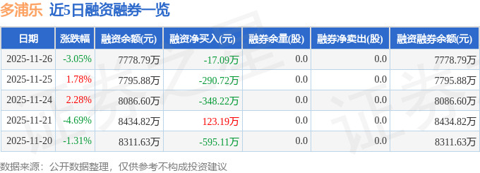 多浦乐融资融券信息显示,融资方面,当日融资买入571.53万元,融资偿还588.62万元,融资净偿还17.09万元。融券方面,融券卖出0.0股,融券偿还0.0股,融券余量0.0股,融券余额0.0万元。融资融券余额7778.79万元。