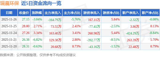 证券之星消息,截至2025年11月26日收盘,瑞晨环保(301273)报收于27.15元,下跌3.04%,换手率1.87%,成交量1.03万手,成交额2863.23万元。