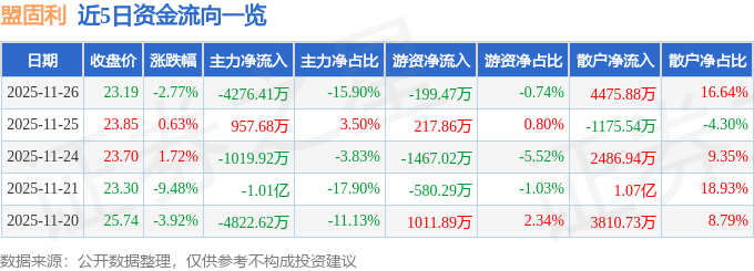 证券之星消息,截至2025年11月26日收盘,盟固利(301487)报收于23.19元,下跌2.77%,换手率4.2%,成交量11.46万手,成交额2.69亿元。