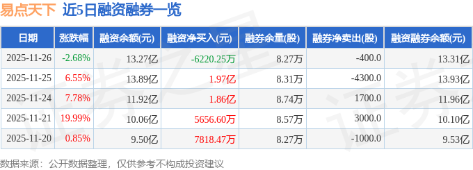 易点天下融资融券信息显示,融资方面,当日融资买入5.96亿元,融资偿还6.59亿元,融资净偿还6220.25万元。融券方面,融券卖出3800.0股,融券偿还4200.0股,融券余量8.27万股,融券余额369.42万元。融资融券余额13.31亿元。