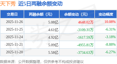 证券之星消息,11月26日,天下秀(600556)融资买入1.81亿元,融资偿还1.34亿元,融资净买入4678.66万元,融资余额5.06亿元。