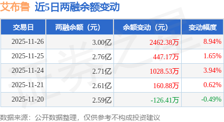 证券之星消息,11月26日,艾布鲁(301259)融资买入7943.52万元,融资偿还5481.14万元,融资净买入2462.38万元,融资余额3.0亿元,近3个交易日已连续净买入累计3938.08万元。