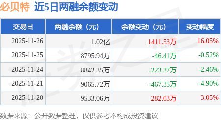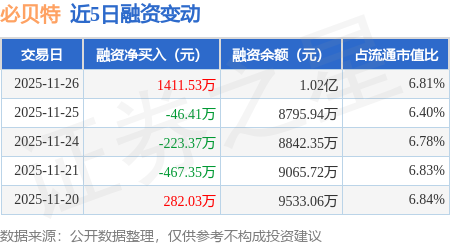 证券之星消息,11月26日,必贝特(688759)融资买入5546.73万元,融资偿还4135.21万元,融资净买入1411.53万元,融资余额1.02亿元。