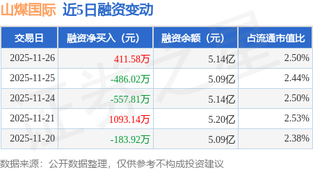 证券之星消息,11月26日,山煤国际(600546)融资买入1135.93万元,融资偿还724.35万元,融资净买入411.58万元,融资余额5.14亿元。