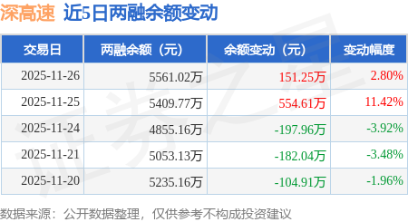 证券之星消息,11月26日,深高速(600548)融资买入285.15万元,融资偿还135.13万元,融资净买入150.02万元,融资余额5544.72万元。