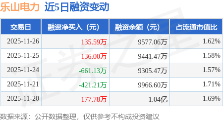 证券之星消息,11月26日,乐山电力(600644)融资买入777.08万元,融资偿还641.48万元,融资净买入135.59万元,融资余额9577.06万元,近20个交易日中有11个交易日出现融资净买入。