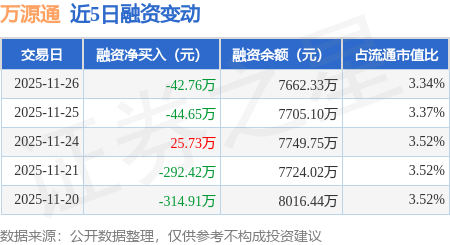 证券之星消息,11月26日,万源通(920060)融资买入344.89万元,融资偿还387.66万元,融资净卖出42.76万元,融资余额7662.33万元。