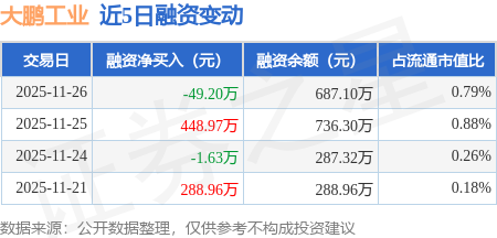 证券之星消息,11月26日,大鹏工业(920091)融资买入548.59万元,融资偿还597.79万元,融资净卖出49.2万元,融资余额687.1万元。