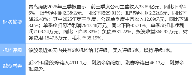 2025年10月30日,国金证券研究员孟灿发布了对青鸟消防的研报《消防机器人进展积极,主业阶段性承压》,该研报对青鸟消防给出“买入”评级。研报中预计公司25~27年营业收入分别为49.0/53.7/59.0亿元,同比-0.4%/+9.5%/+10.0%;归母净利润分别为3.8/5.8/6.5亿元,同比+8.7%/+50.7%/+12.6%,对应26X/18X/16X PE,维持“买入”评级。证券之星数据中心根据近三年发布的研报数据计算,该研报作者对此股的盈利预测准确度为41.04%。