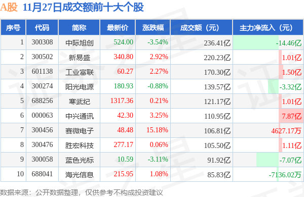 当日A股成交额前10大个股中7只个股收涨,平均涨幅3.57%,其中中际旭创(300308)以成交额236.41亿元排第一。从主力资金流入看,成交额前10大个股中有6只个股呈现主力资金净流入。