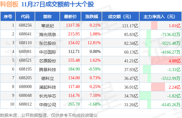 当日科创板成交额前10大个股中7只个股收涨,平均涨幅3.4%,其中寒武纪(688256)以成交额121.17亿元排第一。从主力资金流入看,成交额前10大个股中有3只个股呈现主力资金净流入。