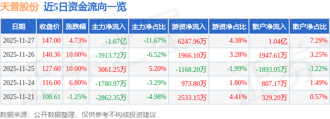 证券之星消息,截至2025年11月27日收盘,天普股份(605255)报收于147.0元,上涨4.73%,换手率7.18%,成交量9.63万手,成交额14.28亿元。