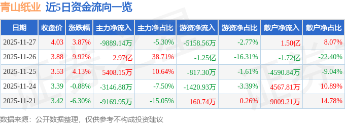 证券之星消息,截至2025年11月27日收盘,青山纸业(600103)报收于4.03元,上涨3.87%,换手率21.01%,成交量464.89万手,成交额18.65亿元。
