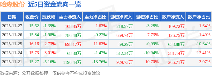 证券之星消息,截至2025年11月27日收盘,哈森股份(603958)报收于15.62元,下跌1.39%,换手率1.93%,成交量4.23万手,成交额6671.57万元。