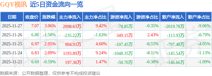 证券之星消息,截至2025年11月27日收盘,GQY视讯(300076)报收于7.07元,上涨3.06%,换手率7.48%,成交量31.7万手,成交额2.23亿元。