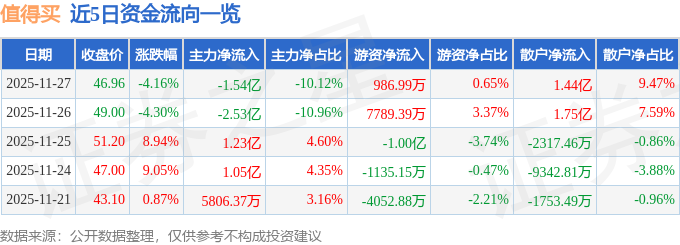 证券之星消息,截至2025年11月27日收盘,值得买(300785)报收于46.96元,下跌4.16%,换手率25.8%,成交量31.56万手,成交额15.23亿元。