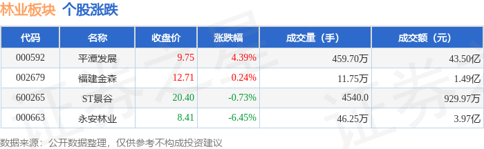 证券之星消息,11月27日林业板块较上一交易日上涨2.26%,平潭发展领涨。当日上证指数报收于3875.26,上涨0.29%。深证成指报收于12875.19,下跌0.25%。林业板块个股涨跌见下表: