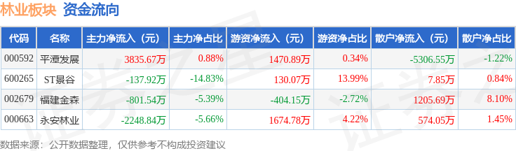 从资金流向上来看,当日林业板块主力资金净流入647.37万元,游资资金净流入2871.59万元,散户资金净流出3518.96万元。林业板块个股资金流向见下表: