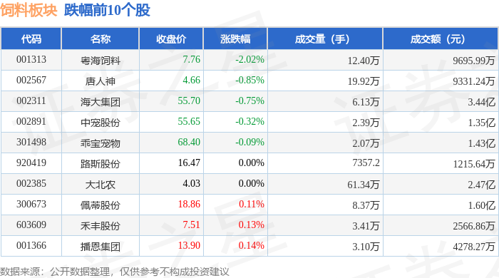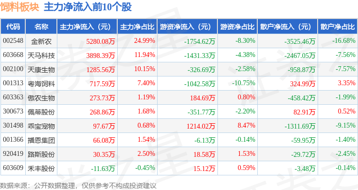 从资金流向上来看,当日饲料板块主力资金净流出713.42万元,游资资金净流出2526.46万元,散户资金净流入3239.88万元。饲料板块个股资金流向见下表: