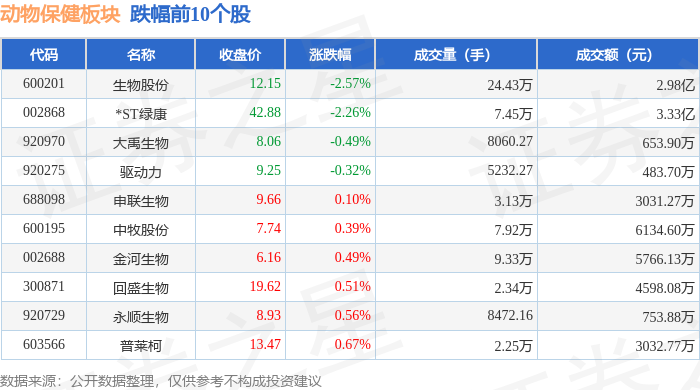 证券之星消息,11月27日动物保健板块较上一交易日下跌0.02%,生物股份领跌。当日上证指数报收于3875.26,上涨0.29%。深证成指报收于12875.19,下跌0.25%。动物保健板块个股涨跌见下表:
