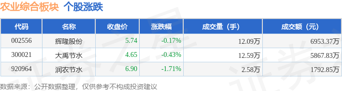 证券之星消息,11月27日农业综合板块较上一交易日下跌0.28%,润农节水领跌。当日上证指数报收于3875.26,上涨0.29%。深证成指报收于12875.19,下跌0.25%。农业综合板块个股涨跌见下表: