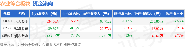 从资金流向上来看,当日农业综合板块主力资金净流入294.87万元,游资资金净流出45.93万元,散户资金净流出248.94万元。农业综合板块个股资金流向见下表: