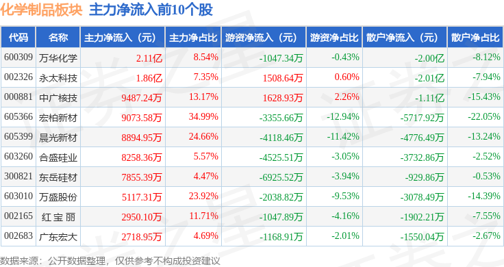 从资金流向上来看,当日化学制品板块主力资金净流入1.5亿元,游资资金净流出3.79亿元,散户资金净流入2.3亿元。化学制品板块个股资金流向见下表:
