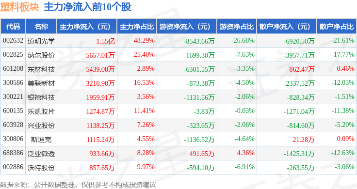 从资金流向上来看,当日塑料板块主力资金净流出2.5亿元,游资资金净流出1.64亿元,散户资金净流入4.13亿元。塑料板块个股资金流向见下表: