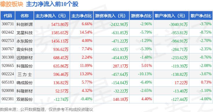 从资金流向上来看,当日橡胶板块主力资金净流出5440.47万元,游资资金净流出2242.37万元,散户资金净流入7682.83万元。橡胶板块个股资金流向见下表: