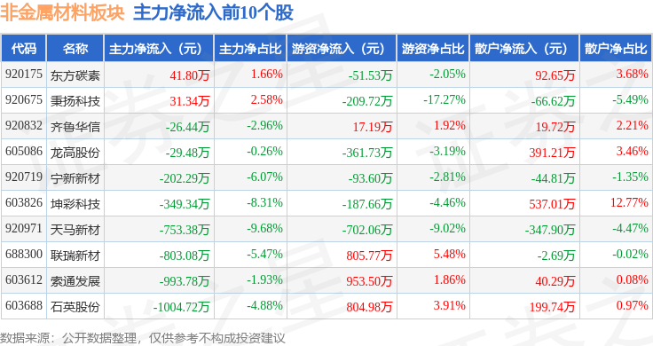 从资金流向上来看,当日非金属材料板块主力资金净流出8004.05万元,游资资金净流入3675.42万元,散户资金净流入4328.64万元。非金属材料板块个股资金流向见下表: