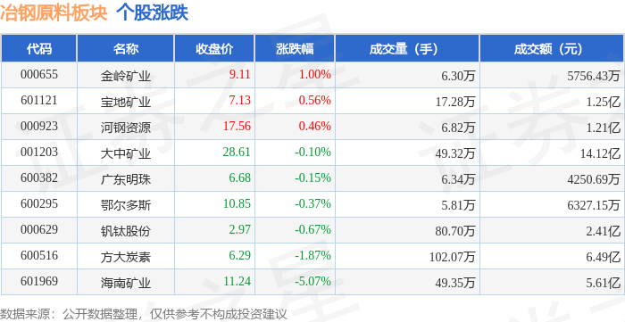 证券之星消息,11月27日冶钢原料板块较上一交易日下跌1.19%,海南矿业领跌。当日上证指数报收于3875.26,上涨0.29%。深证成指报收于12875.19,下跌0.25%。冶钢原料板块个股涨跌见下表: