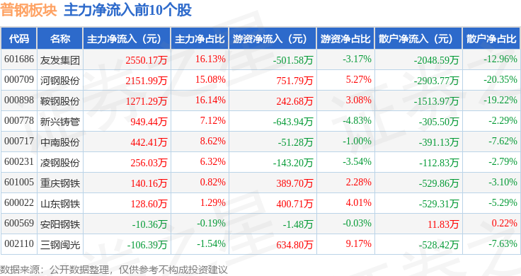 从资金流向上来看,当日普钢板块主力资金净流出8764.52万元,游资资金净流入2419.49万元,散户资金净流入6345.04万元。普钢板块个股资金流向见下表:
