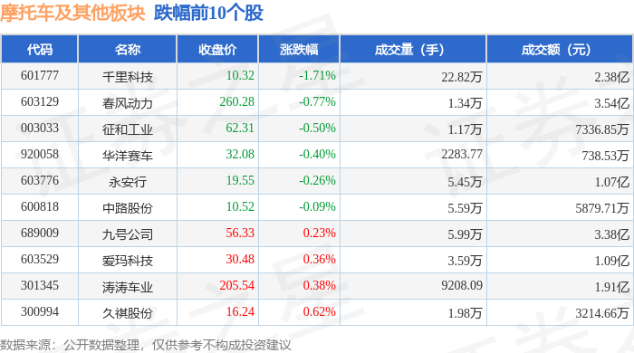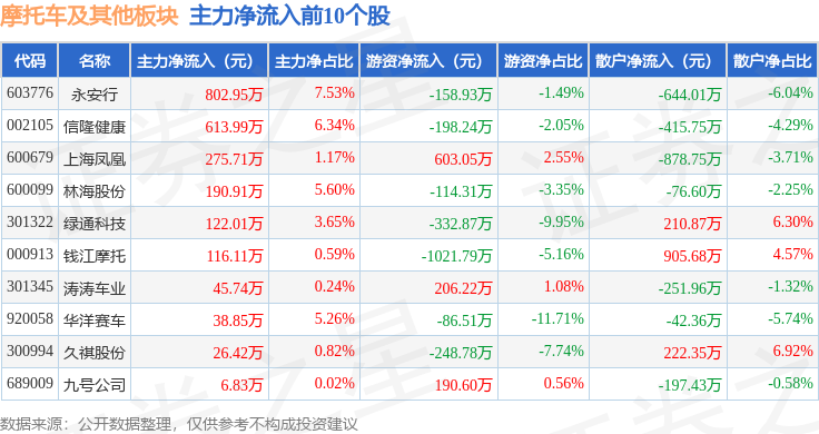 从资金流向上来看,当日摩托车及其他板块主力资金净流出1.14亿元,游资资金净流入5162.03万元,散户资金净流入6190.93万元。摩托车及其他板块个股资金流向见下表: