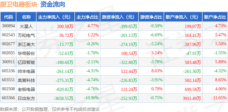从资金流向上来看,当日厨卫电器板块主力资金净流出5025.51万元,游资资金净流出933.4万元,散户资金净流入5958.91万元。厨卫电器板块个股资金流向见下表:
