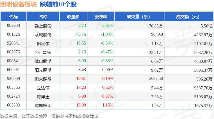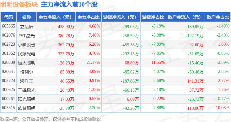 从资金流向上来看,当日照明设备板块主力资金净流出234.63万元,游资资金净流出778.58万元,散户资金净流入1013.21万元。照明设备板块个股资金流向见下表: