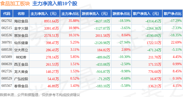 从资金流向上来看,当日食品加工板块主力资金净流入1.12亿元,游资资金净流出5032.86万元,散户资金净流出6121.73万元。食品加工板块个股资金流向见下表: