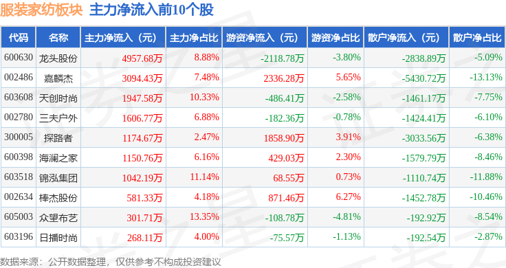 从资金流向上来看,当日服装家纺板块主力资金净流出2.39亿元,游资资金净流入4687.54万元,散户资金净流入1.92亿元。服装家纺板块个股资金流向见下表: