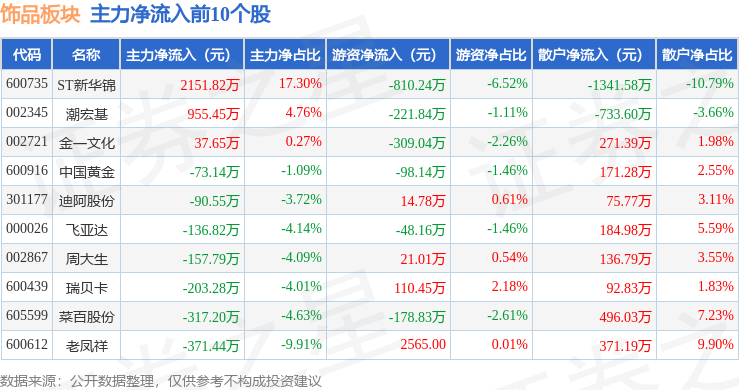 从资金流向上来看,当日饰品板块主力资金净流出3763.93万元,游资资金净流入506.03万元,散户资金净流入3257.9万元。饰品板块个股资金流向见下表: