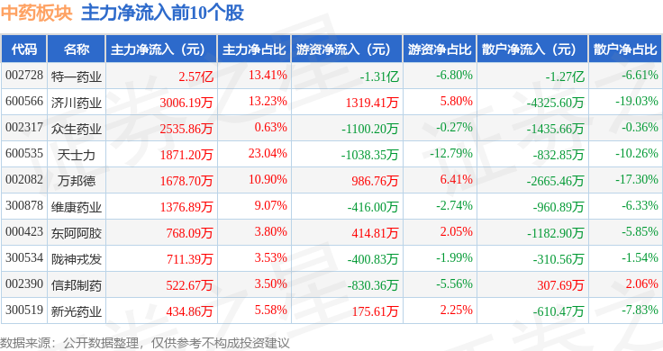 从资金流向上来看,当日中药板块主力资金净流出1901.94万元,游资资金净流入481.36万元,散户资金净流入1420.58万元。中药板块个股资金流向见下表:
