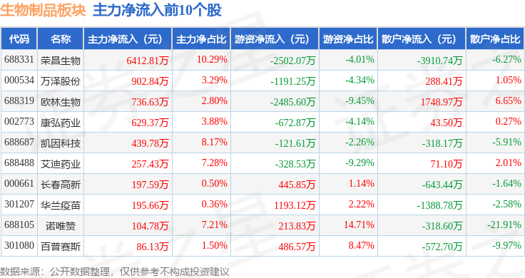 从资金流向上来看,当日生物制品板块主力资金净流出2.51亿元,游资资金净流入2145.01万元,散户资金净流入2.29亿元。生物制品板块个股资金流向见下表: