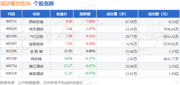 证券之星消息,11月27日酒店餐饮板块较上一交易日上涨0.07%,西安饮食领涨。当日上证指数报收于3875.26,上涨0.29%。深证成指报收于12875.19,下跌0.25%。酒店餐饮板块个股涨跌见下表: