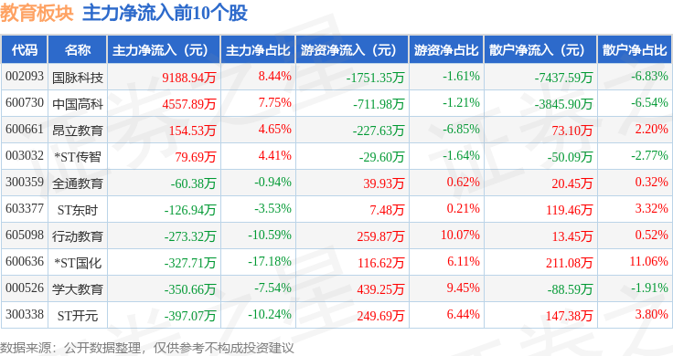 从资金流向上来看,当日教育板块主力资金净流出2134.22万元,游资资金净流入4234.29万元,散户资金净流出2100.08万元。教育板块个股资金流向见下表: